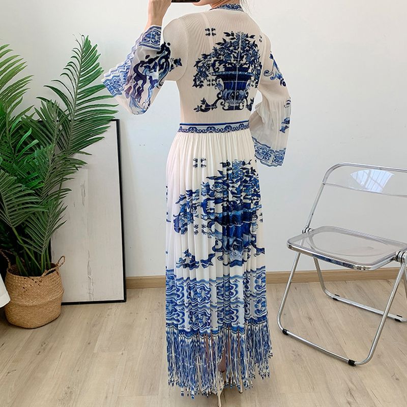 เดรสพลีททรงเอไลน์ Miyake รุ่นใหม่ล่าสุดปี 2025 ลายพิมพ์พอร์ซเลนสีน้ำเงินขาว ซักได้ เอวธรรมชาติ แต่งพู่ ไซส์พลัส ขายส่ง
