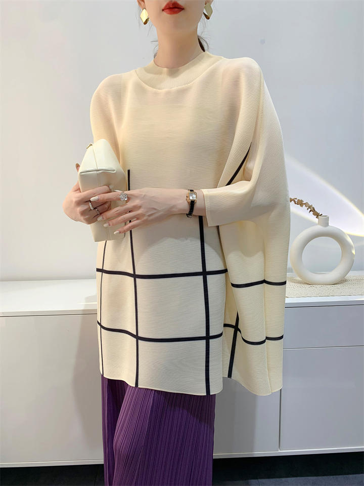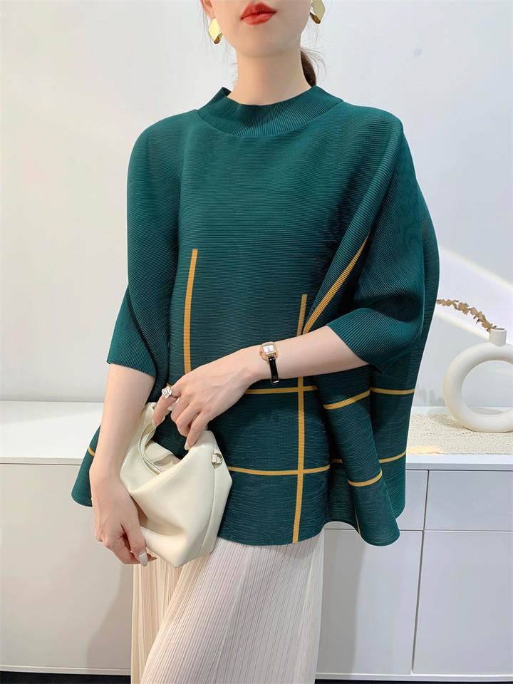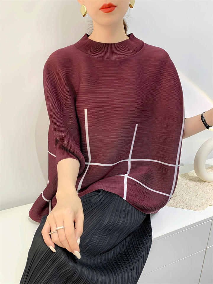 เสื้อยืดพิมพ์ลายจีบแขนยาวสไตล์ลำลองสำหรับผู้หญิง คอลเลคชั่นฤดูใบไม้ผลิ 2025 ของมิยาเกะ แขนทรงปีกค้างคาว ผลิตจากโพลีเอสเตอร์ 100%