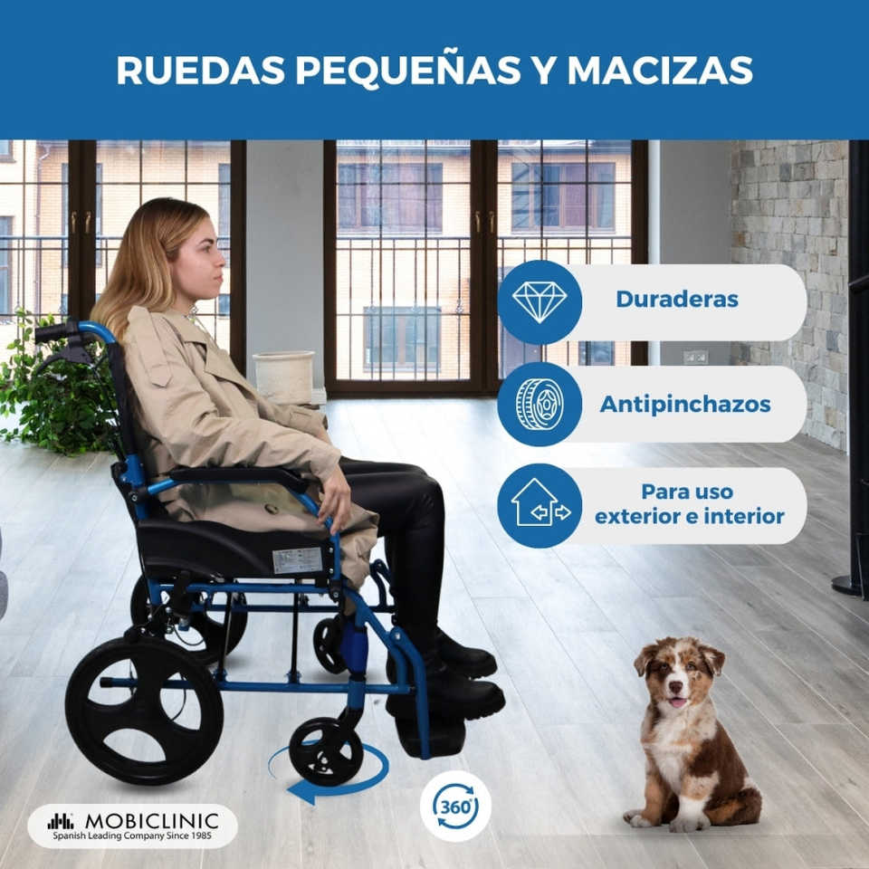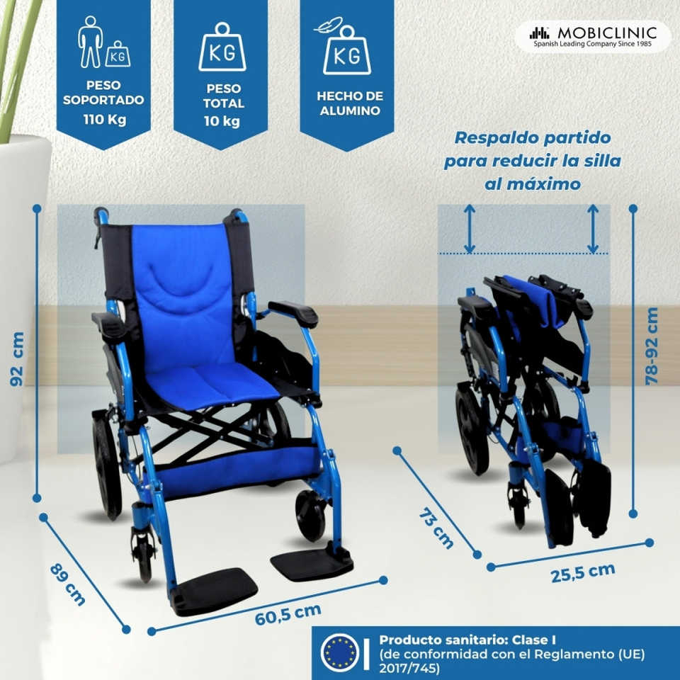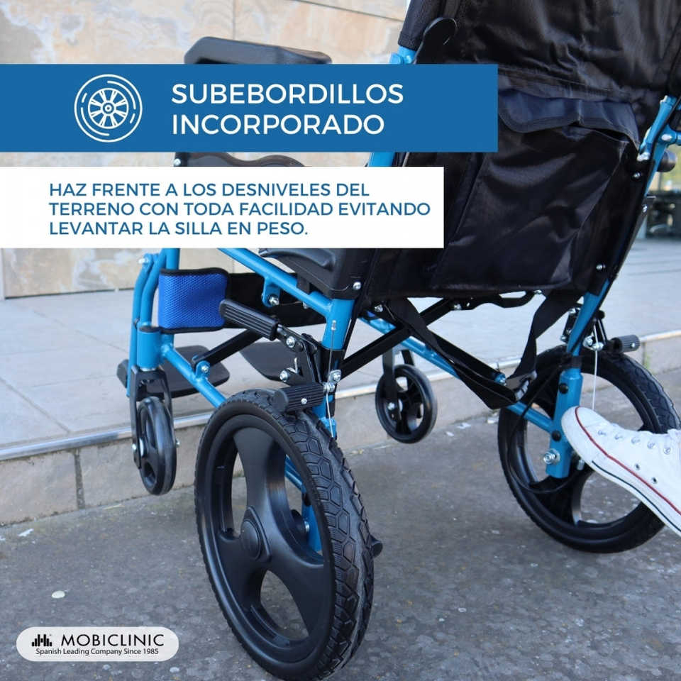 Mobiclinic รถเข็นอลูมิเนียมสีฟ้าพีระมิดแบบแมนนวลความกว้างที่นั่ง46ซม. พร้อมเบรคบนคันโยกออกแบบให้พับได้