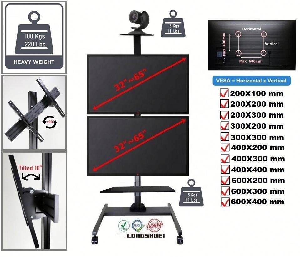 รถเข็นอลูมิเนียมแบบมีขาตั้งทีวีแบบเคลื่อนที่ได้มีความเอียง10 32 "-70" รองรับหน้าจอ220LBS ความจุสำหรับใช้ในสำนักงาน