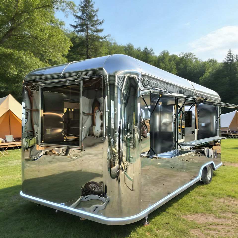 รถขายอาหารเคลื่อนที่พร้อมหน้าต่างบริการคู่และดีไซน์โค้งมน เหมาะสำหรับขายขนมและเครื่องดื่มในพื้นที่ชมวิว