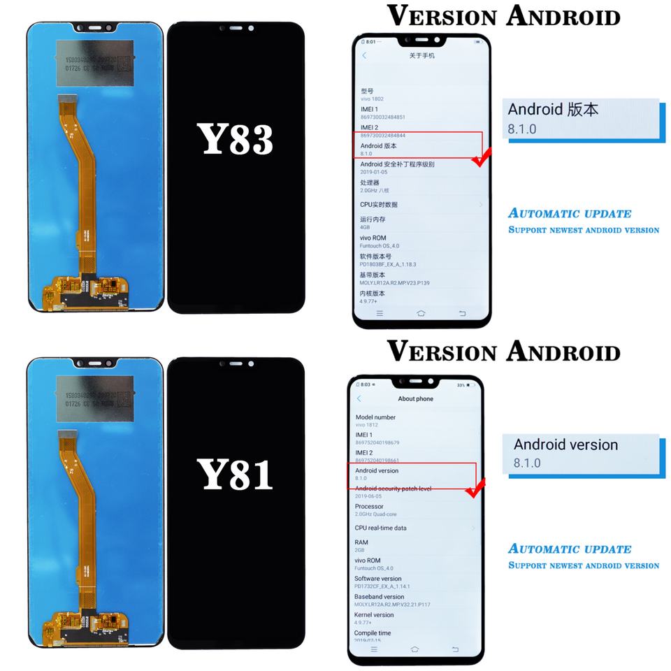 โทรศัพท์มือถือแอลซีดีสําหรับVivo Y3 Y11 Y12 Y15 Y17 Y71 Y75 Y79 Y85 Y81 Y83 Y91 Y93 Y95 Y19 Y21