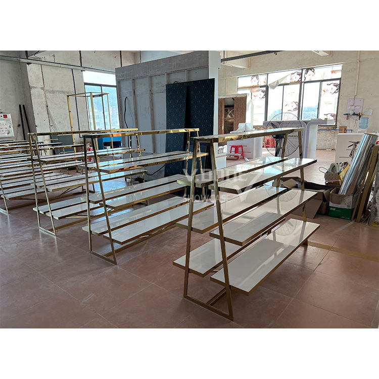 ชั้นวางสินค้าสำหรับร้านค้ามือถือและร้านขายเสื้อผ้า ทำจากกระจก/ไม้อัด/โลหะ สามารถปรับแต่งสีและขนาดได้ เหมาะสำหรับใช้ในห้างสรรพสินค้า