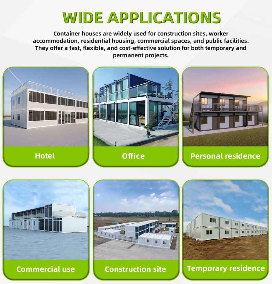โรงแรม, วิลล่า, บ้านคอนเทนเนอร์ที่อยู่อาศัย, บ้านภาชนะ, อาคารสำนักงาน, โรงเรียน, โกดังการประยุกต์ใช้