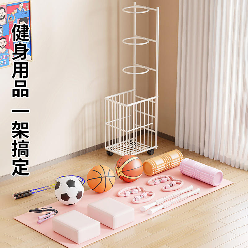 ชั้นวางอุปกรณ์กีฬาเหล็กเคลื่อนที่สีขาวพร้อมล้อสำหรับจัดเก็บในร่ม ดัมเบล เสื่อโยคะ ไม้แบดมินตัน