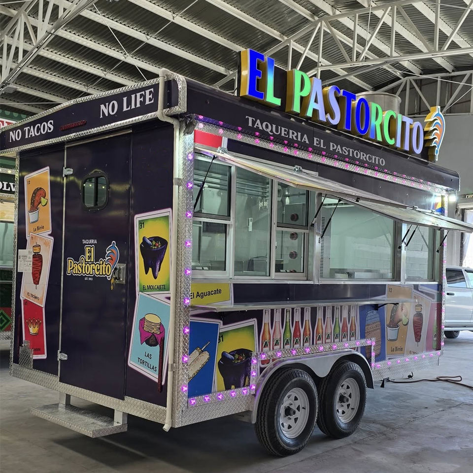 รถพ่วงขายอาหารในครัวเคลื่อนที่รถบรรทุกอาหารที่ได้รับใบอนุญาตภาชนะใส่พิซซ่าและบาร์บีคิวรถเข็นสำหรับร้านอาหารและบาร์กาแฟ