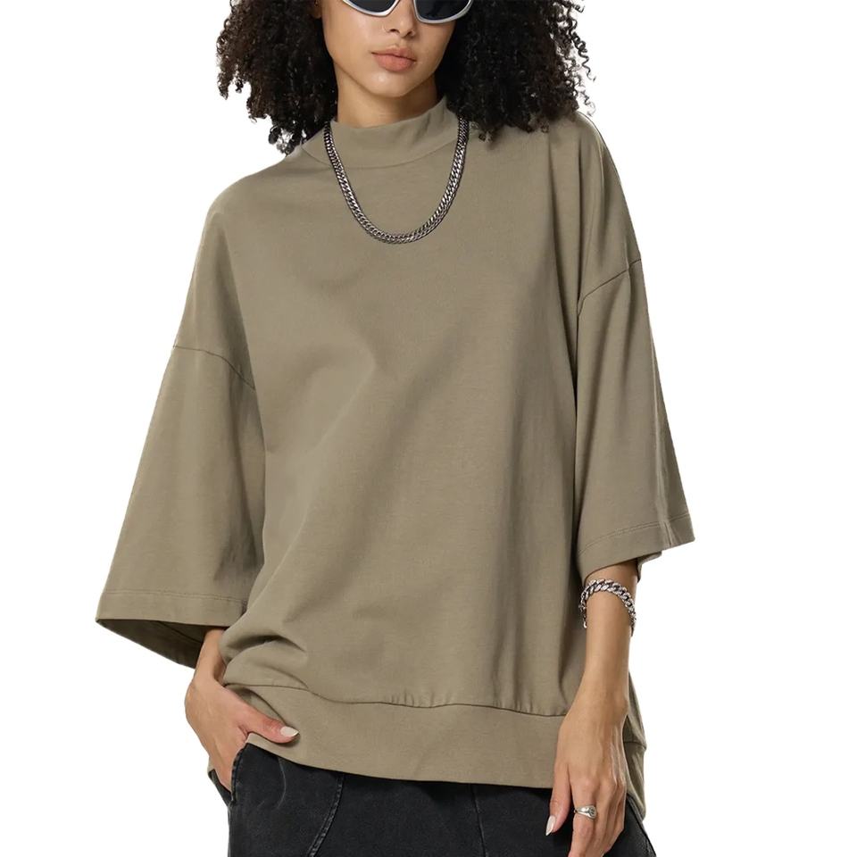 เสื้อยืดคอกลมทรงโอเวอร์ไซส์ คอหนา ทรงหลวม ผ้าเจอร์ซีย์ สตรีทแวร์ ผู้หญิง แบบเรียบ ชายเสื้อแบบริบ แขนสั้น สกรีนลายได้