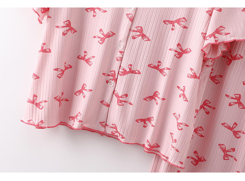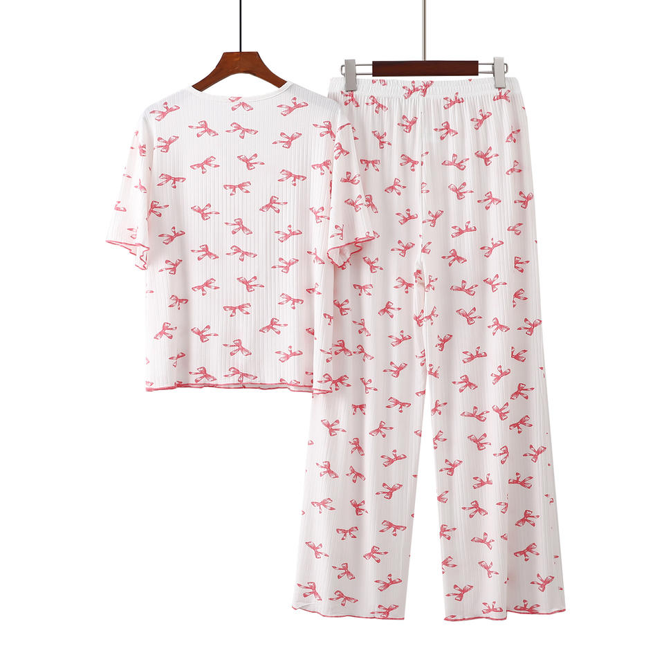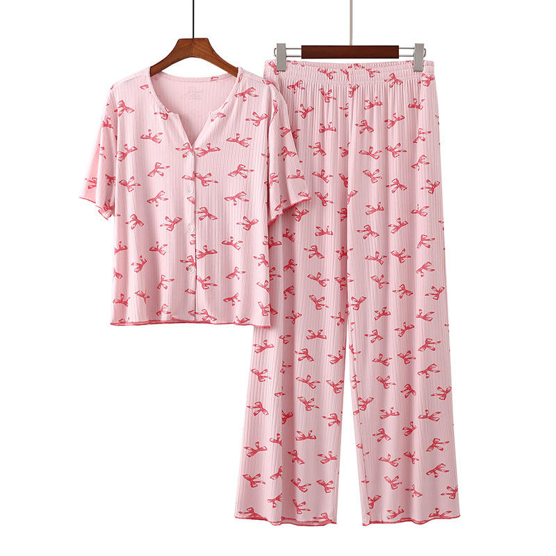 PJ-055 ชุดนอน 2 ชิ้นเอวยางยืดลายเสือดาวผู้หญิงแขนสั้นกางเกงขายาวถักบางทรงหลวมฤดูใบไม้ผลิฤดูร้อน