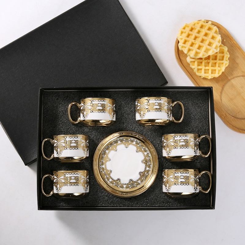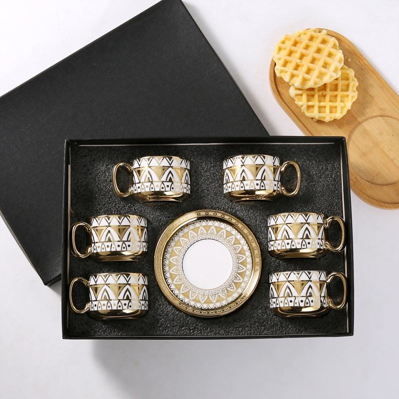 ชุดแก้วกาแฟเซรามิกเคลือบอิเล็คโทรเพลทสีดำสีขาวและสีทอง6ถ้วยแบบโมเดิร์น12ชิ้นสำหรับเป็นของขวัญทางธุรกิจ
