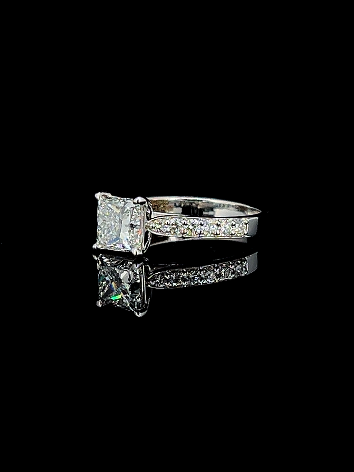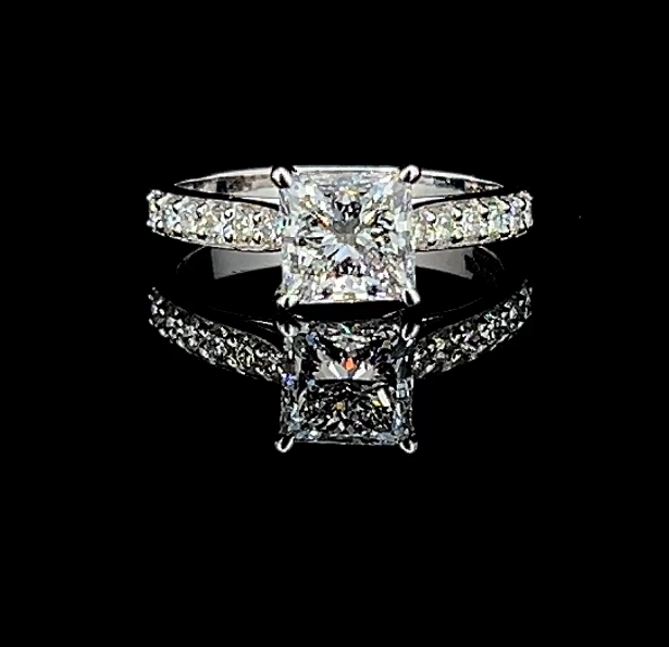 แหวนเพชรทรงเจ้าหญิง 2 กะรัต ดีไซน์โมเดิร์น ประดับเพชรรอบเพชรเม็ดเดี่ยว ทอง 14K พร้อมเพชรข้างความใสระดับ SI จากธรรมชาติ เครื่องประดับหมั้นสุดหรู
