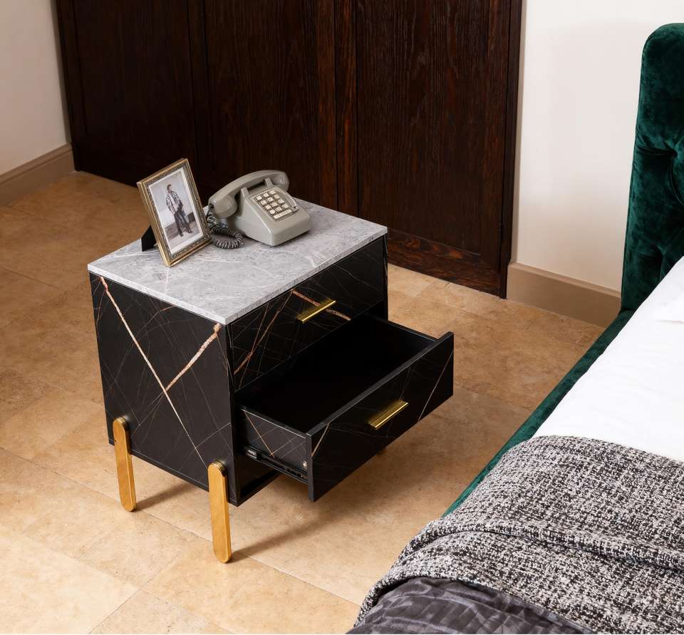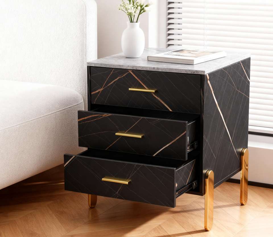 โต๊ะข้างเตียง 3 ลิ้นชัก ดีไซน์ทันสมัย ลายหินอ่อน ขาสีทอง
