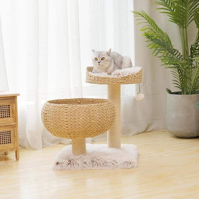 ต้นไม้แมว 3 ชั้น รุ่นโมเดิร์น พร้อมเบาะรองนอน วัสดุไม้และป่านศรนารายณ์ พร้อมเชือก ตะกร้าหวาย และเสาข่วน DreamCraft