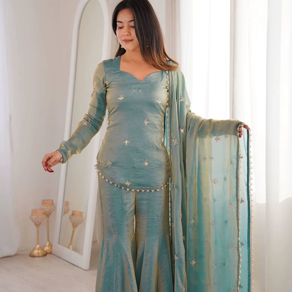 ชุดคุร์ตะผ้าไหมเฟนดี้สำหรับผู้หญิงแบบ 3 ชิ้น รุ่นใหม่ พร้อมเสื้อ กางเกง และผ้าคลุมไหล่ สำหรับงานแต่งงานและงานปาร์ตี้ แห้งเร็ว