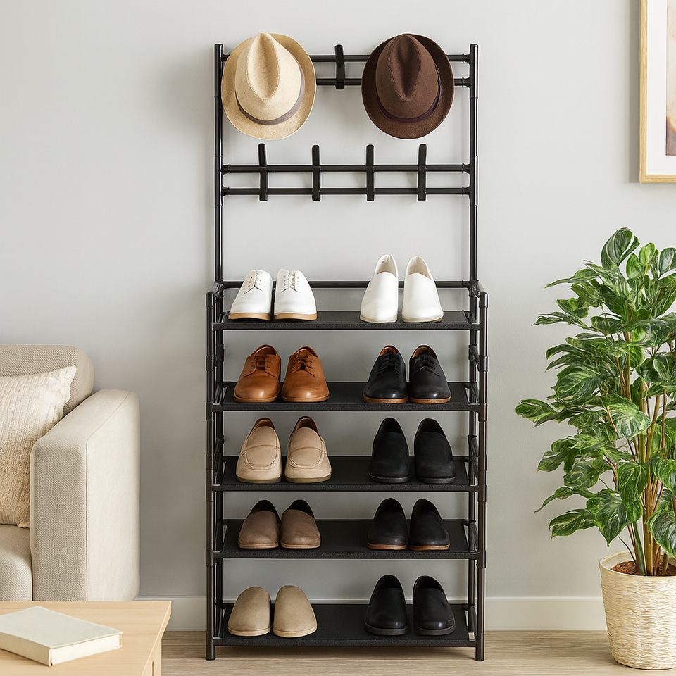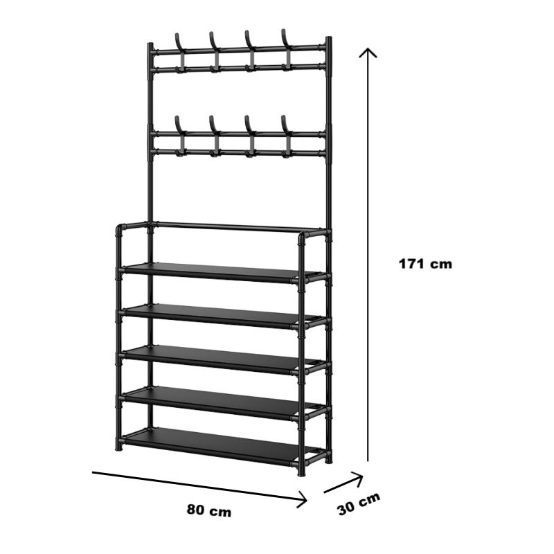 ชั้นเก็บรองเท้าสแตนเลส5ชั้นแบบโมเดิร์นพร้อมตะขอ8อันชั้นวางของโลหะสีดำสำหรับจัดบ้านและโรงแรม (V2-NF6605-80)