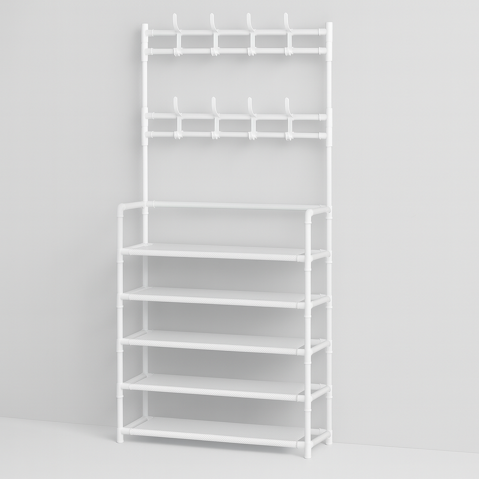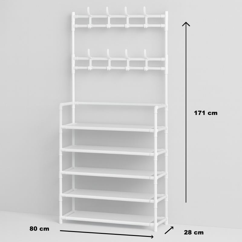 ราวแขวนเสื้อโค้ทโลหะสีขาว 5 ชั้น รุ่นโมเดิร์น พร้อมที่เก็บรองเท้าเหล็ก 8 ตะขอ สำหรับห้องนั่งเล่น ห้องนอน ห้องออกกำลังกาย (V2-NF6604-80)