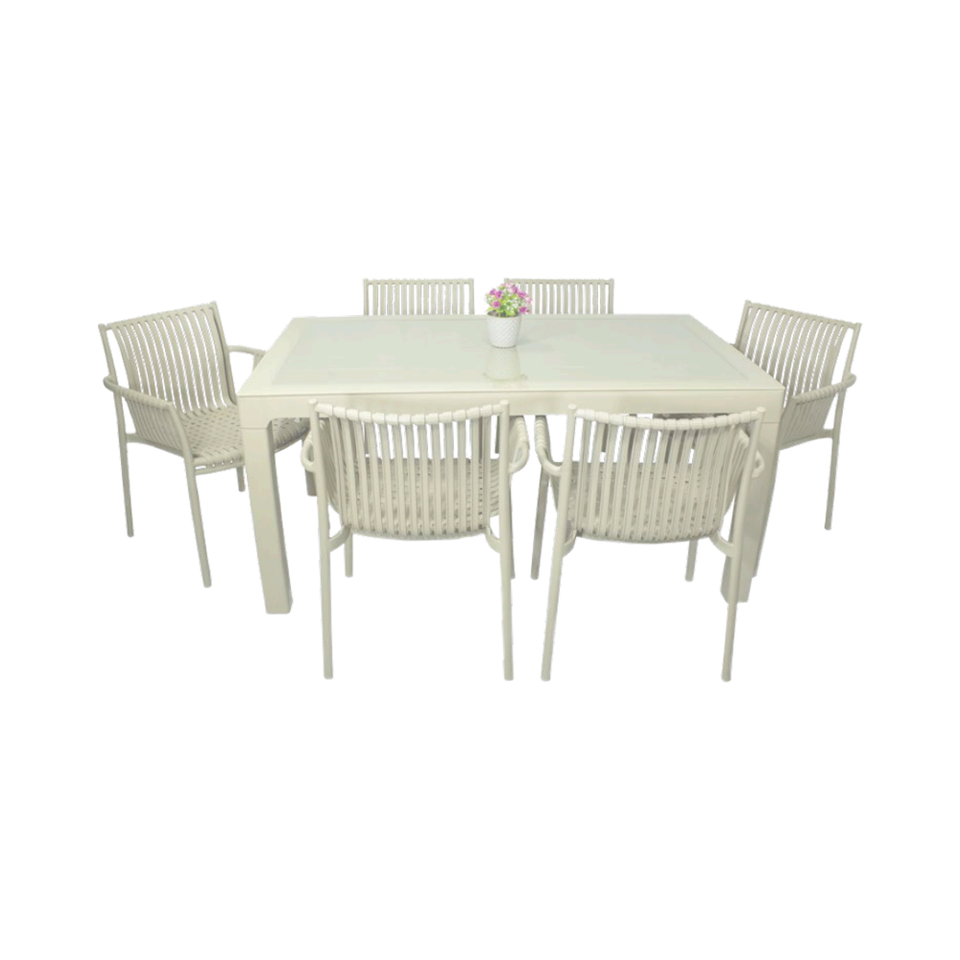 ชุดเฟอร์นิเจอร์รับประทานอาหารกลางแจ้ง 6 ชิ้น ทันสมัย ทำจากหวาย ทนทานต่อสภาพอากาศ พร้อมโต๊ะกระจกและเก้าอี้ สำหรับสวนและโรงเรียน