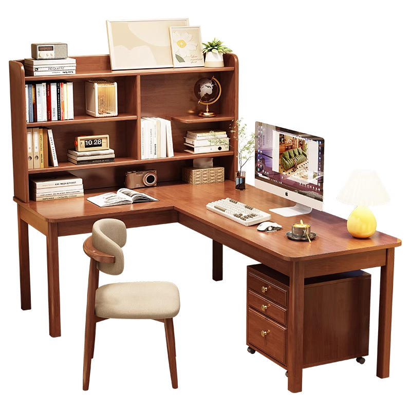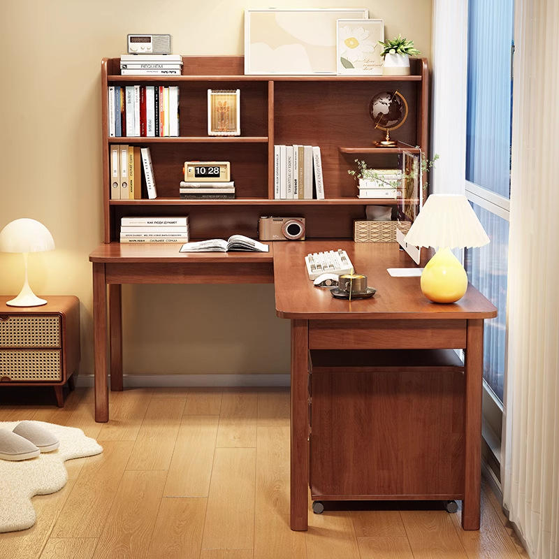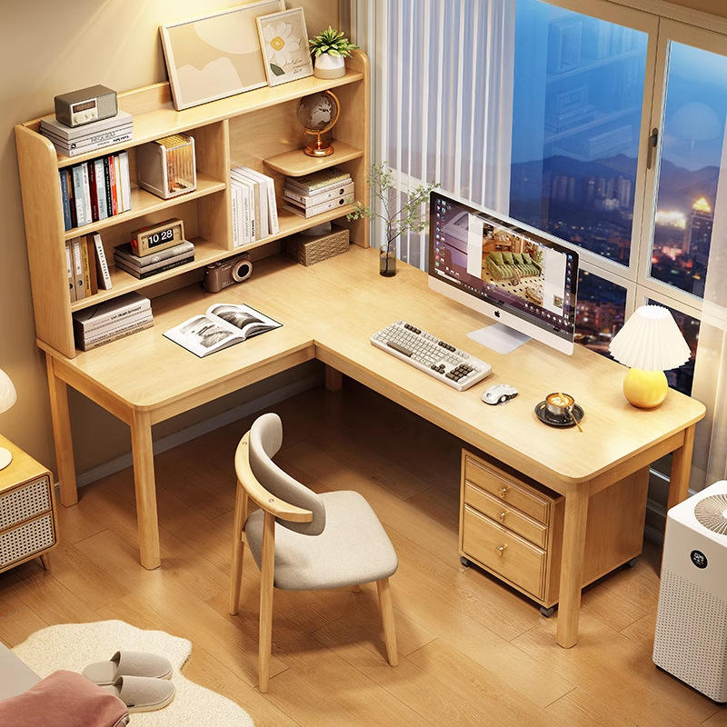 โต๊ะทำงานรูปตัว L แบบ 7 ทิศทางทันสมัย พร้อมชั้นวางหนังสือในตัว โต๊ะเขียนหนังสือไม้จริงสำหรับอพาร์ทเมนต์ขนาดเล็ก ใช้พื้นที่ได้อย่างเหมาะสม