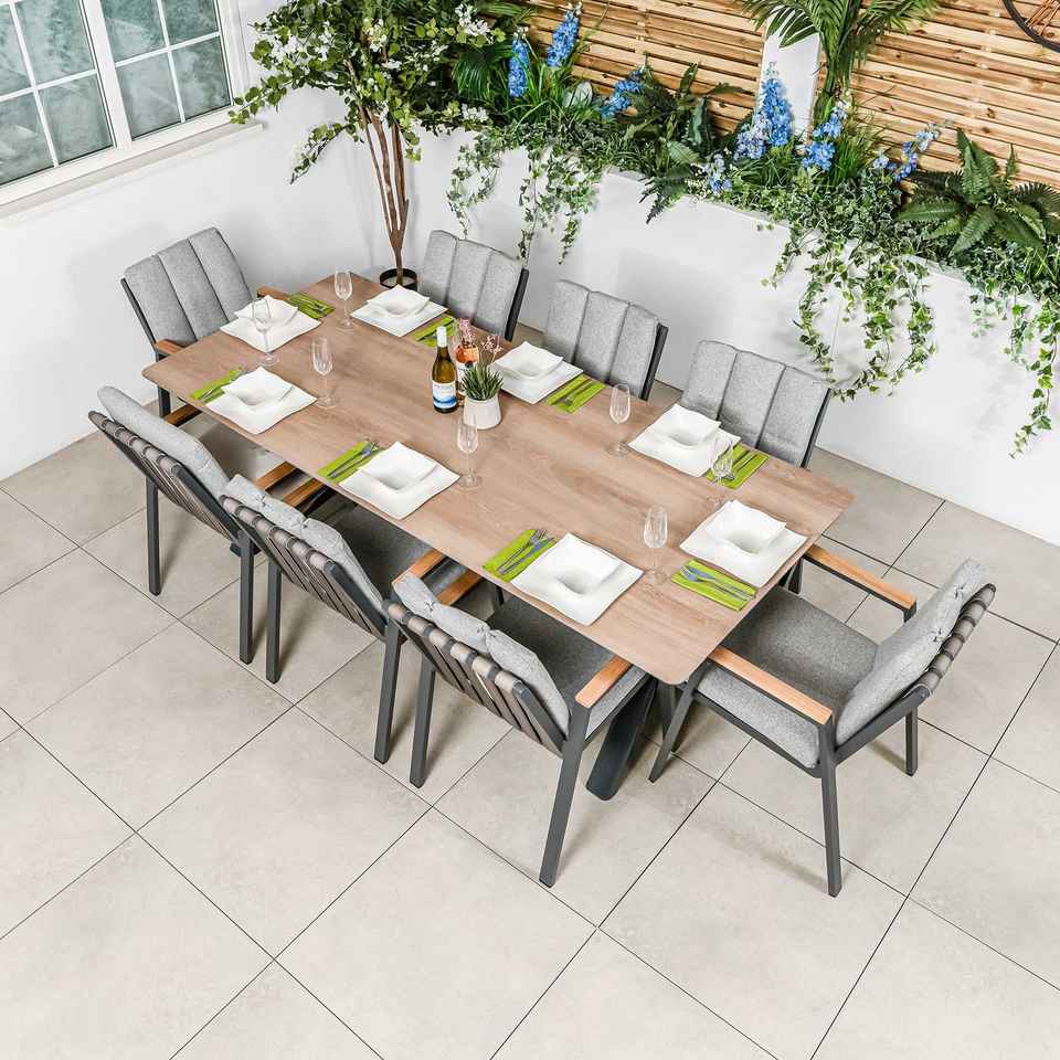 ชุดโต๊ะรับประทานอาหารอลูมิเนียมสำหรับสวน 8 ที่นั่ง ดีไซน์ทันสมัย โต๊ะแบบไม้ระแนง พร้อมเก้าอี้กลางแจ้งแบบซ้อนเก็บได้ ที่วางแขนทำจากไม้