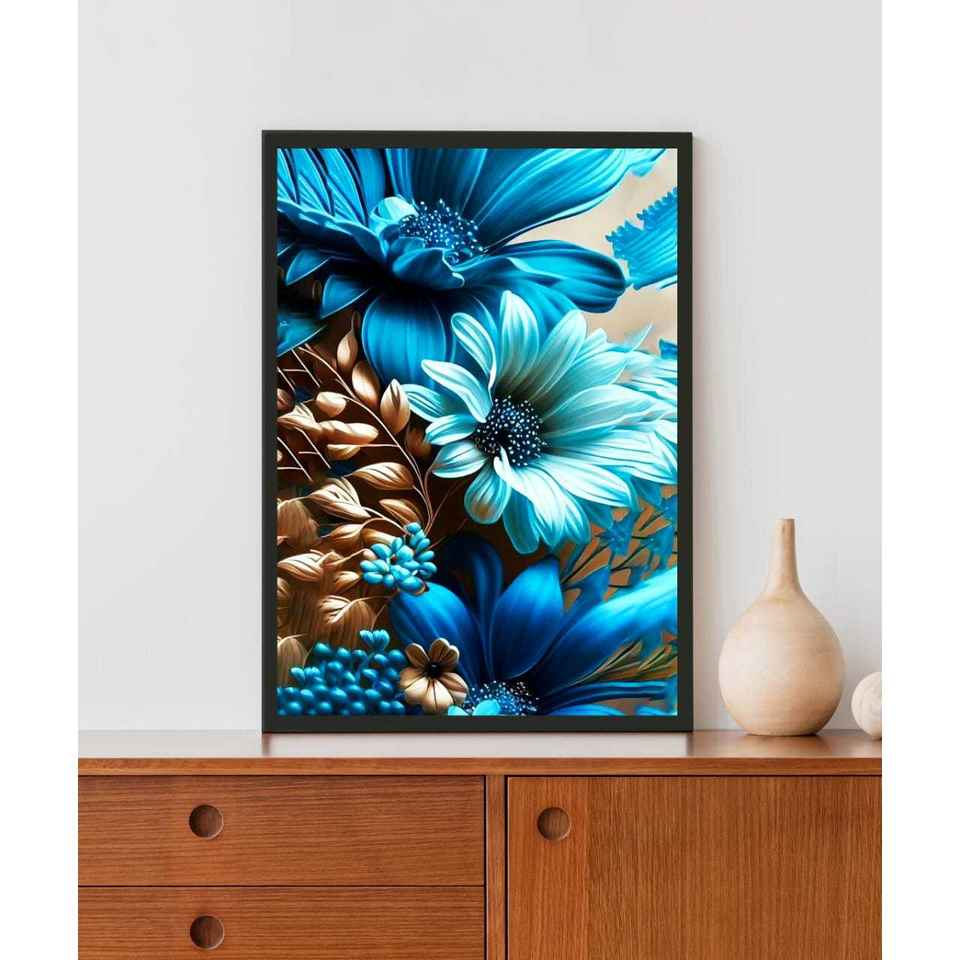 งานศิลปะติดผนังอะคริลิค LED แบบนามธรรมสมัยใหม่ ภาพพิมพ์สีน้ำทำมือ ลายดอกไม้สีฟ้าอมเขียว หนา 2.4 ซม. กรอบพรีเมียม พร้อมไฟ LED 1 เส้น