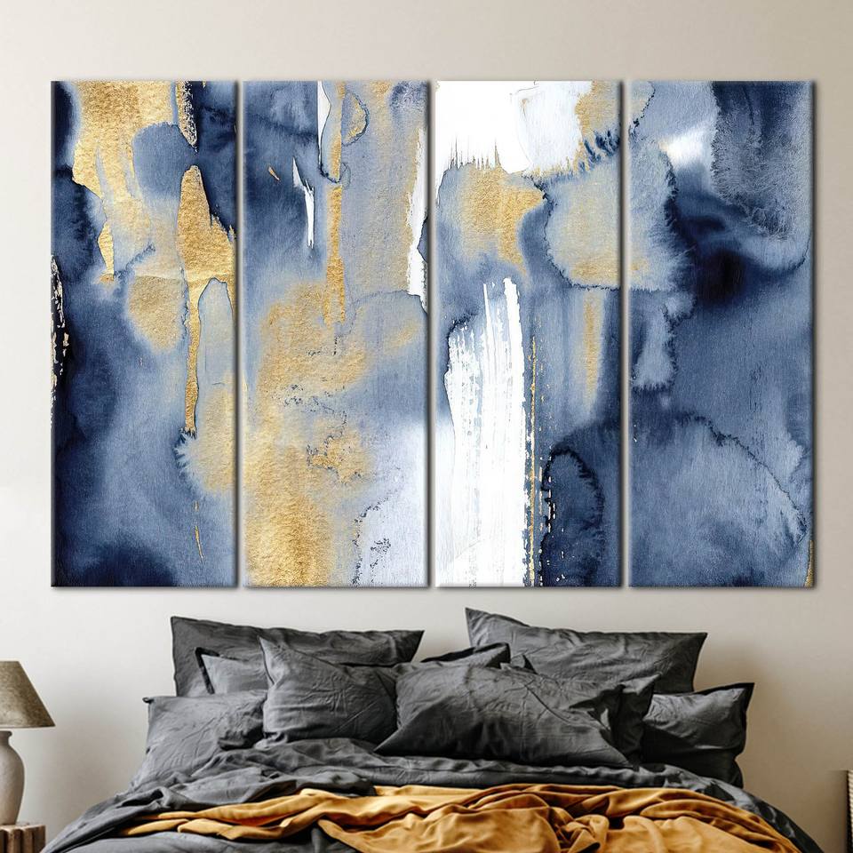 ภาพพิมพ์บนผ้าใบแบบนามธรรมสมัยใหม่ - งานศิลปะสีน้ำเงินและสีทอง,4P: ห่อหุ้มแบบแกลเลอรี