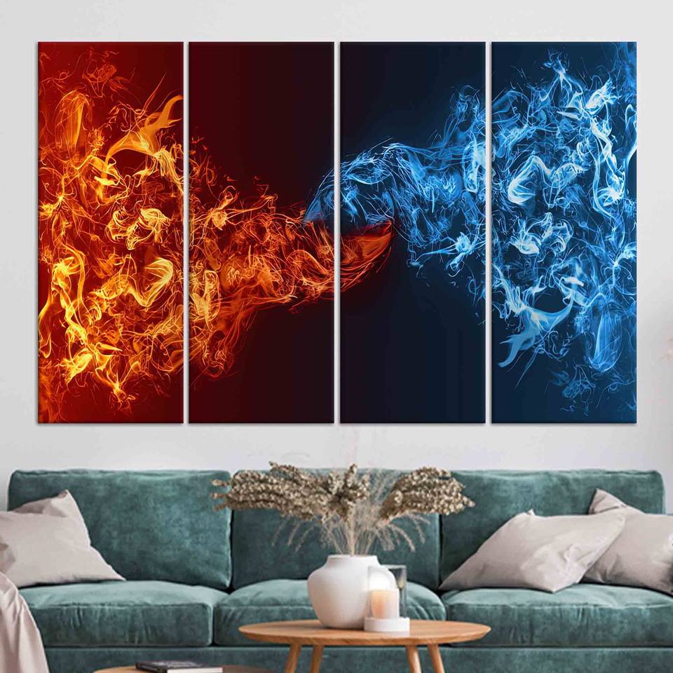 ภาพพิมพ์บนผ้าใบแก้วแบบนามธรรมสมัยใหม่: งานศิลปะไฟและน้ำแข็งที่งดงาม ชุดผ้าใบ 4 ชิ้น