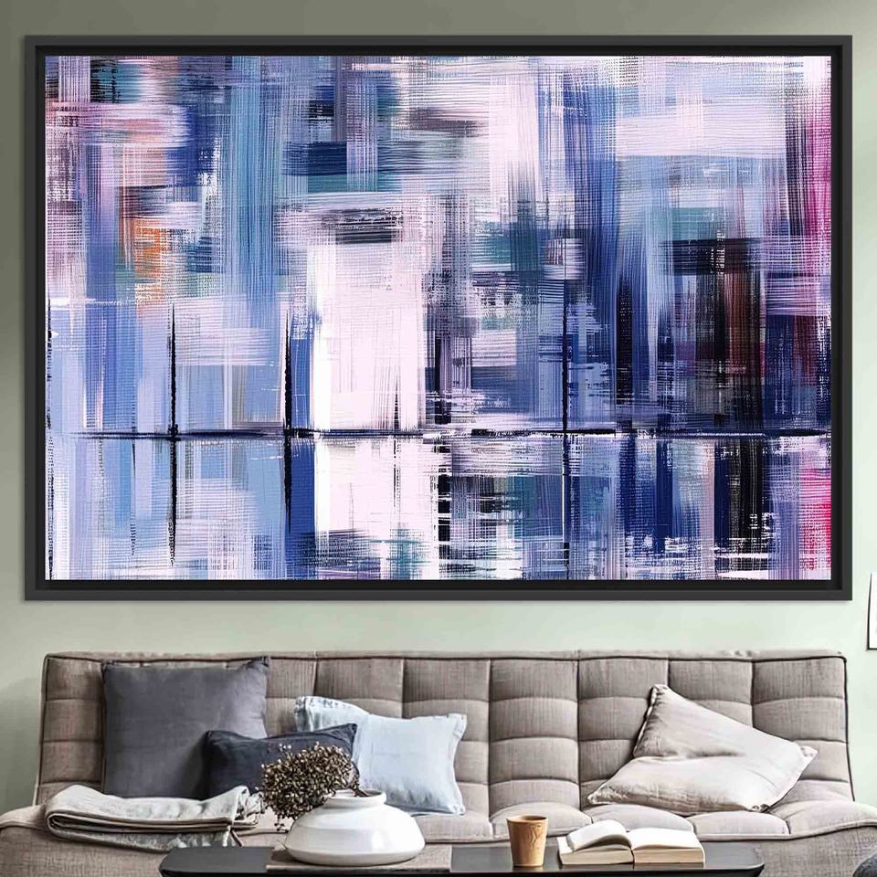 ศิลปะติดผนังกระจกแบบนามธรรมสมัยใหม่: งานศิลปะบนผ้าใบพิมพ์ลายสีสันสดใส พร้อมกรอบสีดำ