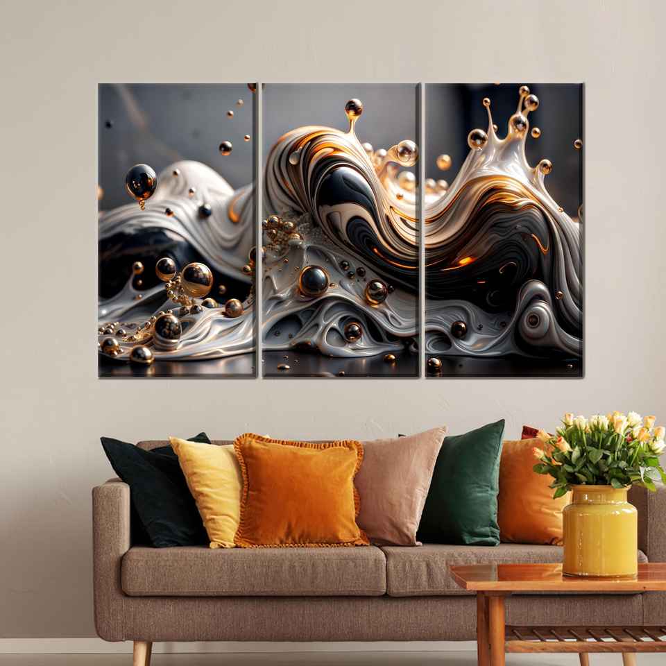 ศิลปะบนผืนผ้าใบพิมพ์ลายหมุนสีทองและสีดำแบบแอบสแตรกต์รูปคลื่นของเหลวที่ทันสมัย3P: แกลเลอรีในห่อ
