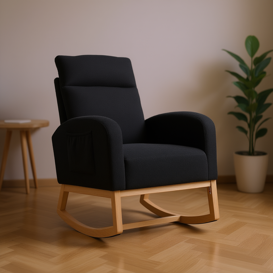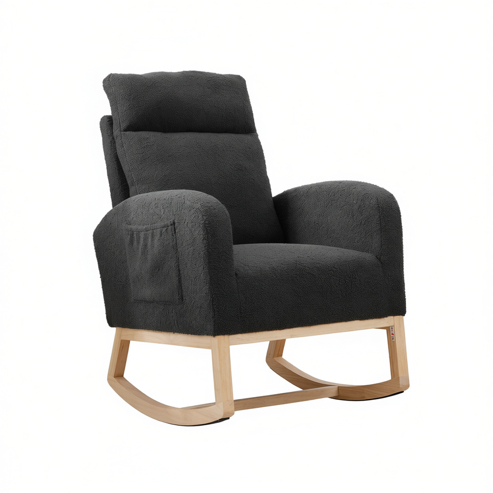 เก้าอี้โยกพนักพิงสูงทันสมัย ขาไม้เนื้อแข็ง หุ้มเบาะสีเทาเข้ม เก้าอี้นั่งเล่นในห้องนั่งเล่น นั่งสบาย
