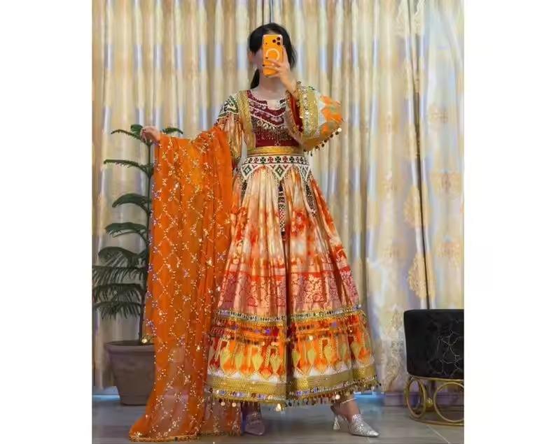 ชุดเดรสงานเลี้ยงสไตล์อัฟกันสมัยใหม่ สีส้ม ผ้าไหม ประดับเลื่อม พร้อมผ้าคลุมไหล่แบบกระจกเงา ชุดเพราฮันทันสมัยสำหรับงานเทศกาลแบบอัฟกัน