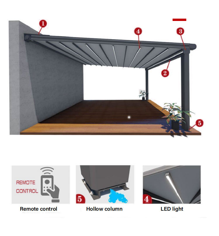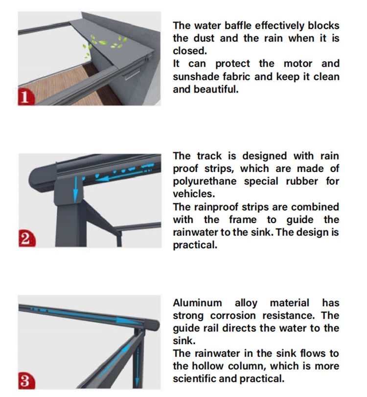 การประยุกต์ใช้:กลางแจ้ง, เชิงพาณิชย์, ป้องกันแสงแดด, ม่านบังแดด, กันสาดยืดหดได้, Water proof, ไฟฟ้า, ตกแต่ง, ป้องกันฝน, ระเบียง, ศาลาพักผ่อน, นำแสง, ลานกลางแจ้ง, สวนกลางแจ้ง, กันสาดเพอร์โกลาแบบใช้เครื่องยนต์, ป้องกันรังสียูวี, ร้านกาแฟ, สระว่ายน้ำ, ที่อยู่อาศัย, วิลล่า