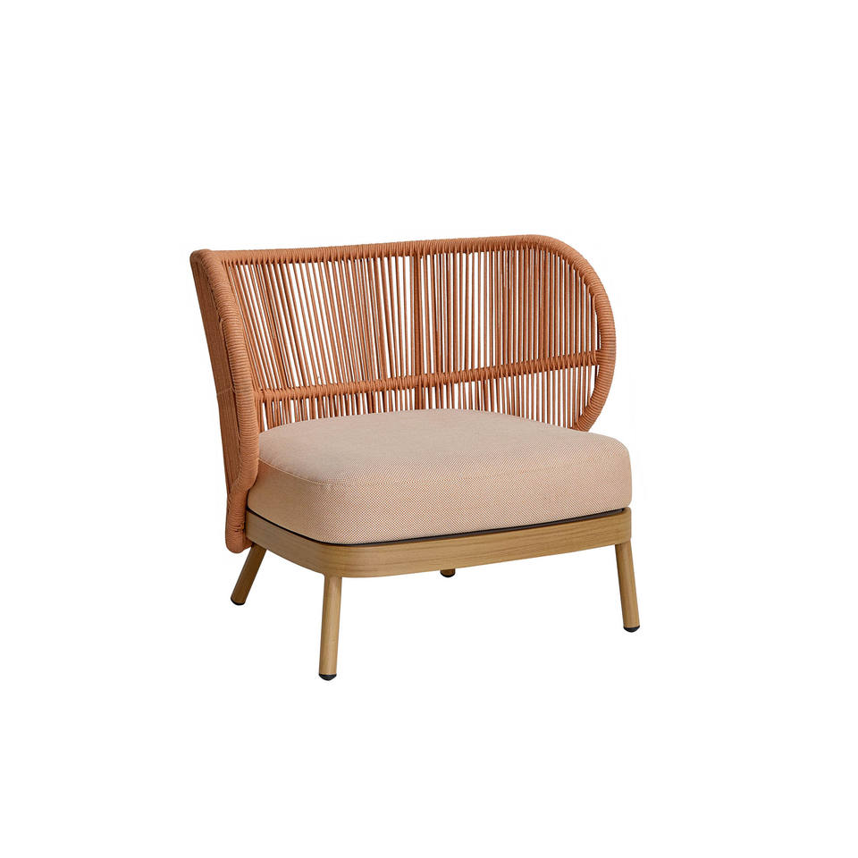 เก้าอี้พักผ่อนโครงอะลูมิเนียมทันสมัยพร้อมพนักพิงเชือกถักและขาไม้สักแท้ พร้อมเบาะกันน้ำสำหรับใช้ในโรงแรมและกลางแจ้ง
