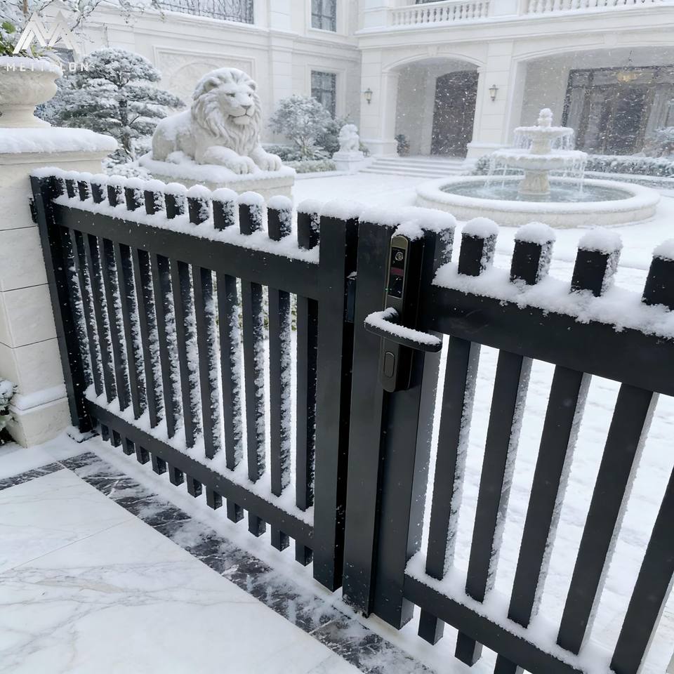 ประตูรั้วสวนอะลูมิเนียมทันสมัยพร้อมแผ่นไม้ระแนงแนวตั้งและระบบล็อคประตูอัจฉริยะเพื่อความปลอดภัยในสวนและลานบ้าน