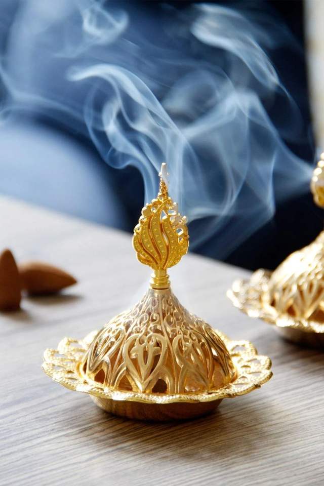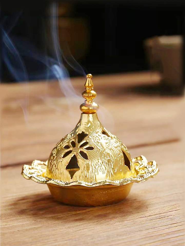 เตาเผากำยานเหล็กสีทองสไตล์อาหรับสมัยใหม่ขนาดเล็กสำหรับใช้ในบ้าน พร้อมกลิ่นอำพันและลาเวนเดอร์