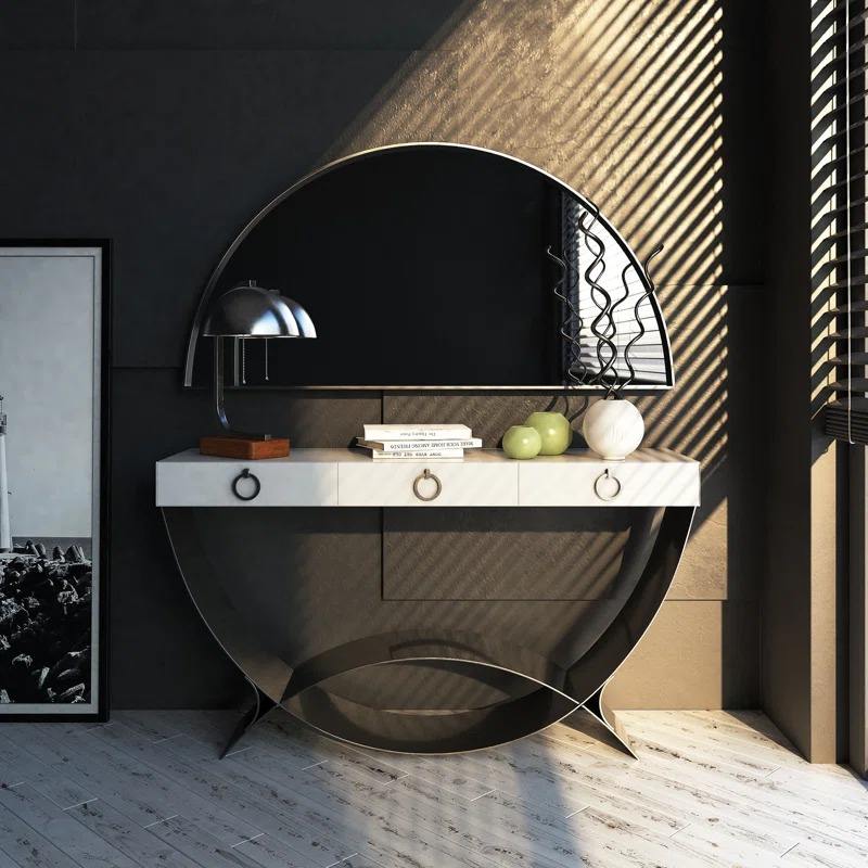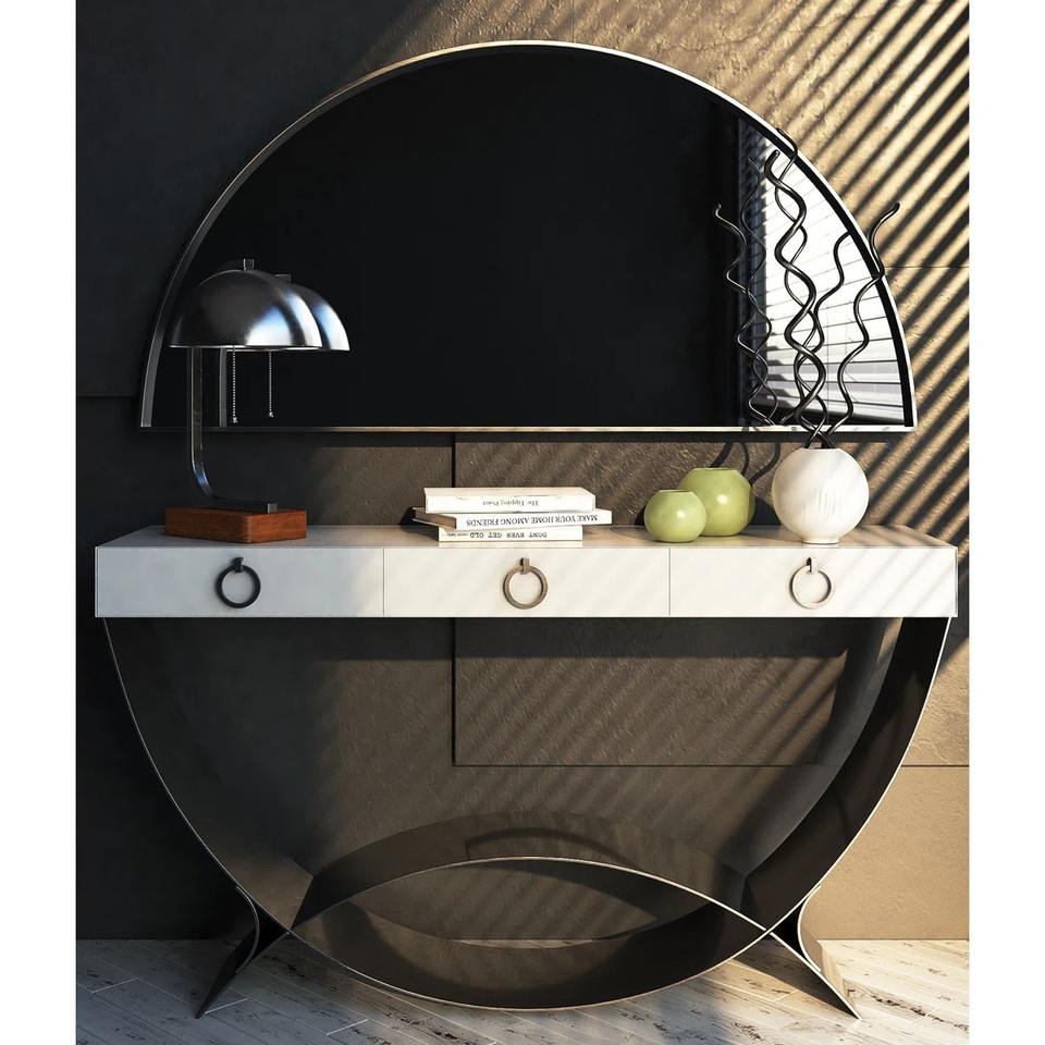 โต๊ะคอนโซลอเนกประสงค์สไตล์อาร์ตเดโคสมัยใหม่ สีขาว พร้อมลิ้นชักเก็บของ 3 ช่อง และฐานโลหะสีดำรูปพระจันทร์เสี้ยว ดีไซน์โดดเด่น เหมาะสำหรับทางเข้าโรงแรม