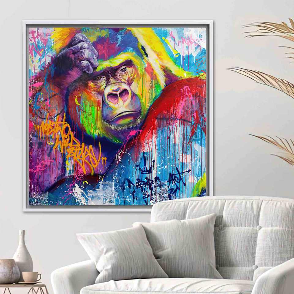 งานศิลปะสมัยใหม่: ภาพพิมพ์บนผ้าใบลายกอริลลาในท่าทางกำลังไตร่ตรอง พร้อมกรอบสีขาว