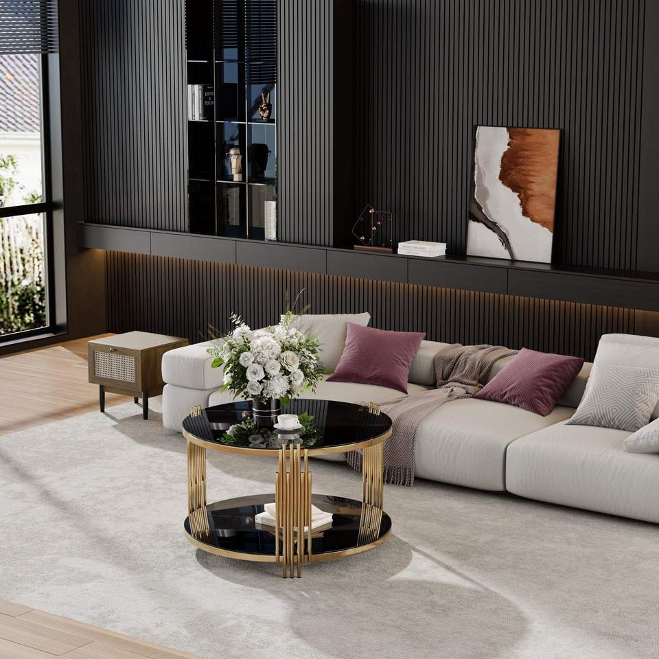 โต๊ะกาแฟโลหะทรงโมเดิร์นแบบอสมมาตร หน้าโต๊ะกระจกสีดำ พร้อมฐานกลมโลหะสีทองและชั้นวางด้านล่าง