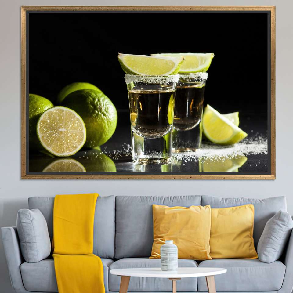ผ้าใบตกแต่งบาร์สไตล์โมเดิร์น: ภาพพิมพ์เตกีล่าช็อตและมะนาว พร้อมกรอบสีทอง