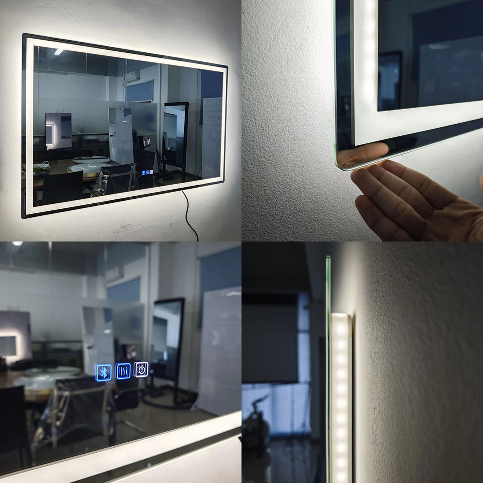กระจกอัจฉริยะทรงสี่เหลี่ยมผืนผ้าสำหรับร้านตัดผมสมัยใหม่ พร้อมไฟ LED ป้องกันฝ้า ปรับแต่งขนาดได้ ออกแบบกราฟิกได้ เชื่อมต่อ Bluetooth/Wi-Fi รองรับ 3D