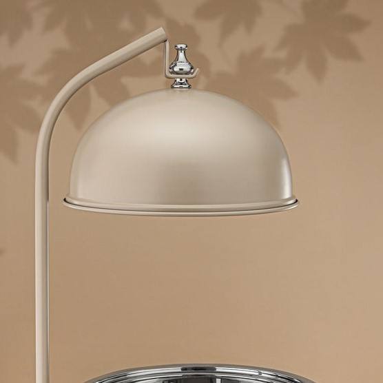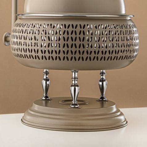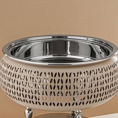 ถาดอุ่นอาหารทรงกลมสแตนเลสสีเบจทันสมัย พร้อมฝาปิดแบบแขวนและลวดลายตัดด้วยเลเซอร์ สำหรับงานจัดเลี้ยงบุฟเฟ่ต์งานแต่งงาน