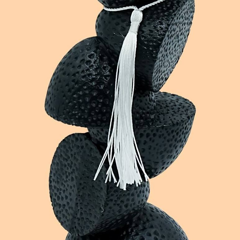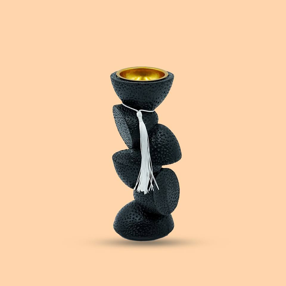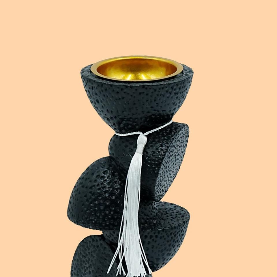 เชิงเทียนหินอ่อนสีดำแบบซ้อนกันพร้อมถ้วยโลหะสีทองและพู่สีขาวสไตล์เซน ของตกแต่งบ้าน