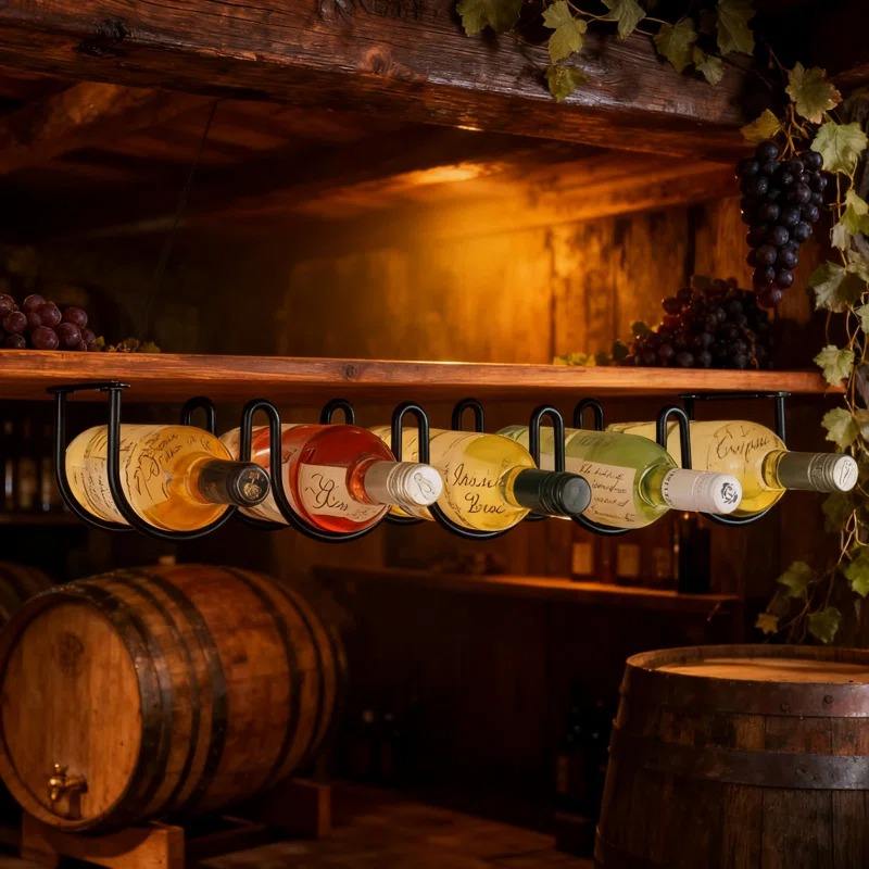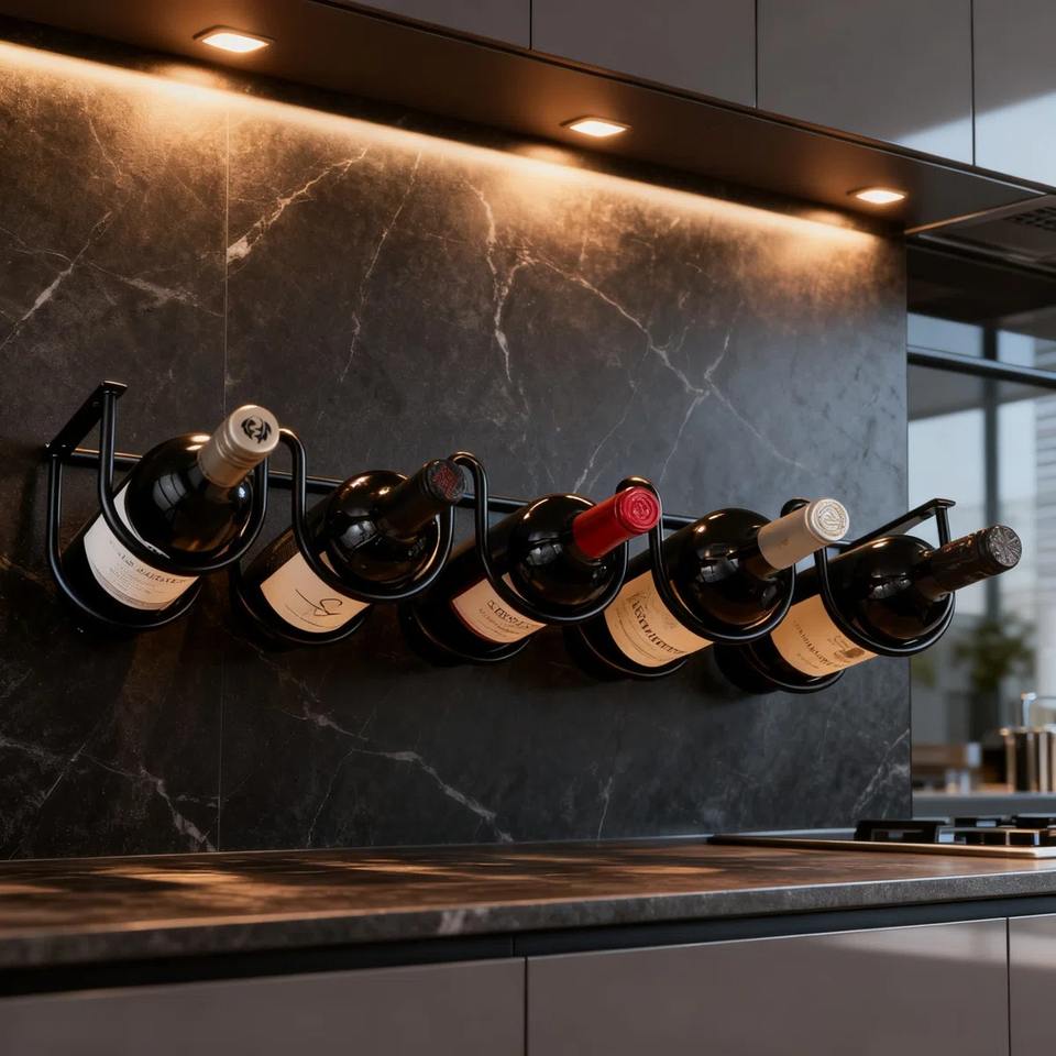 Modern Black Metal Wall Mounted 5 Bottle Wine Rack Organizer for Kitchen Backsplash Space Saving Horizontal Wine Bottle Holder