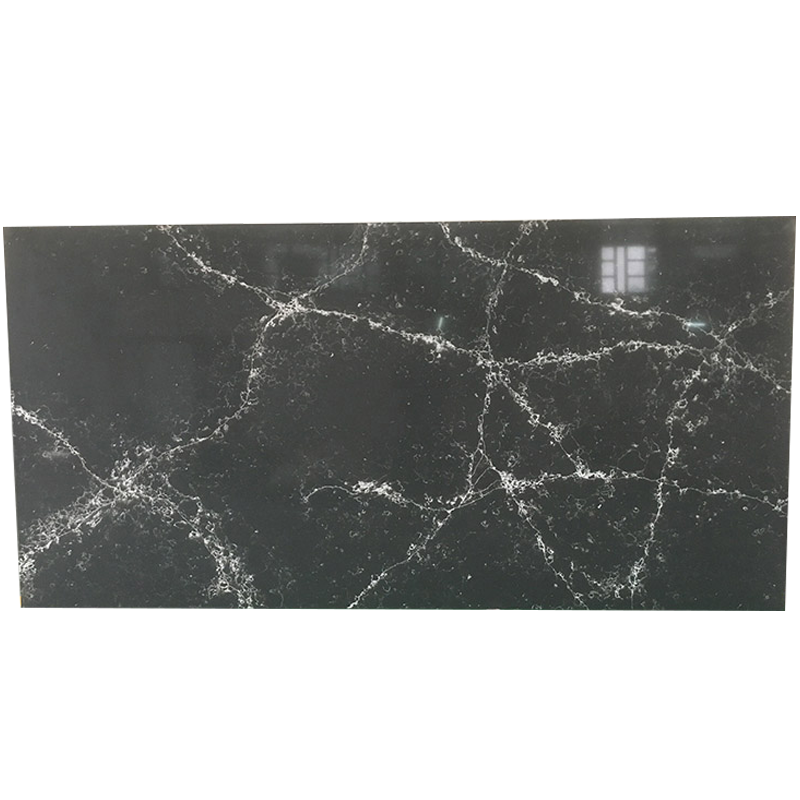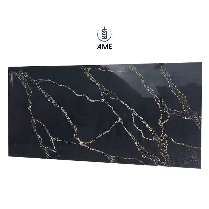 แผ่นควอตซ์สีดำโมเดิร์นขนาดใหญ่ กันน้ำ ทนทาน ลายเส้นสีขาวแบบคาลาคัตต้า สำหรับท็อปครัว/ท็อปโต๊ะ/ท็อปโต๊ะเครื่องแป้ง
