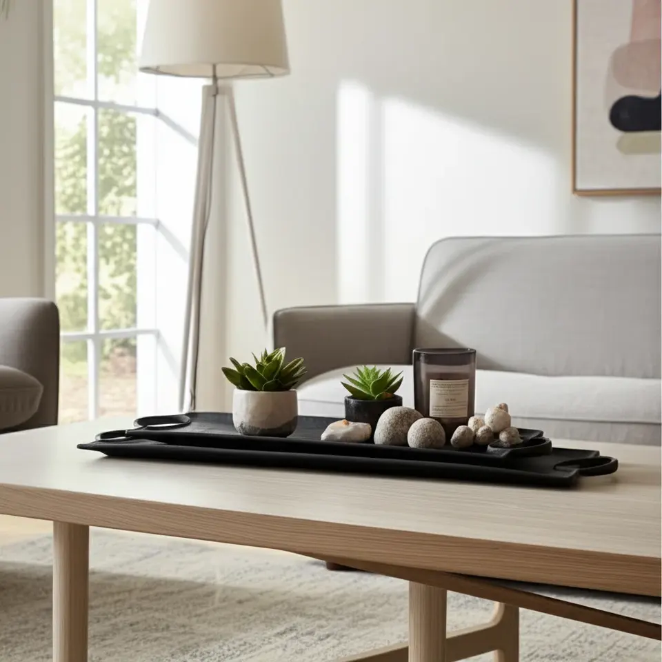 ถาดเสิร์ฟทรงสี่เหลี่ยมผืนผ้าสีดำทันสมัย ชุดสองใบ พร้อมหูจับ สำหรับตกแต่งบ้าน ห้องครัว ถาดอเนกประสงค์