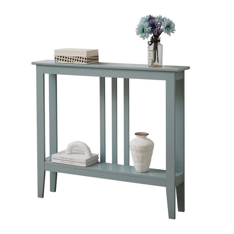 โต๊ะคอนโซลแบบปรับเปลี่ยนได้สีน้ำเงินทันสมัย พร้อมกระจกเงา ดีไซน์แผ่นไม้แนวตั้ง ชั้นวางด้านล่างแบบเปิด เหมาะสำหรับทางเดินแคบ ใช้ในโรงแรมหรือบริเวณทางเข้า