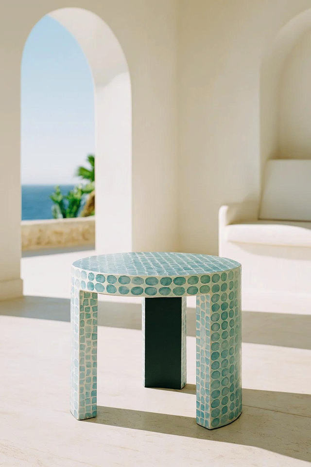 โต๊ะข้างทรงกลมประดับเปลือกหอยมุกสีฟ้าทันสมัยเก้าอี้เน้นเน้นเปลือกหอยทำด้วยมือสำหรับห้องนั่งเล่นชายฝั่งหรือทันสมัย
