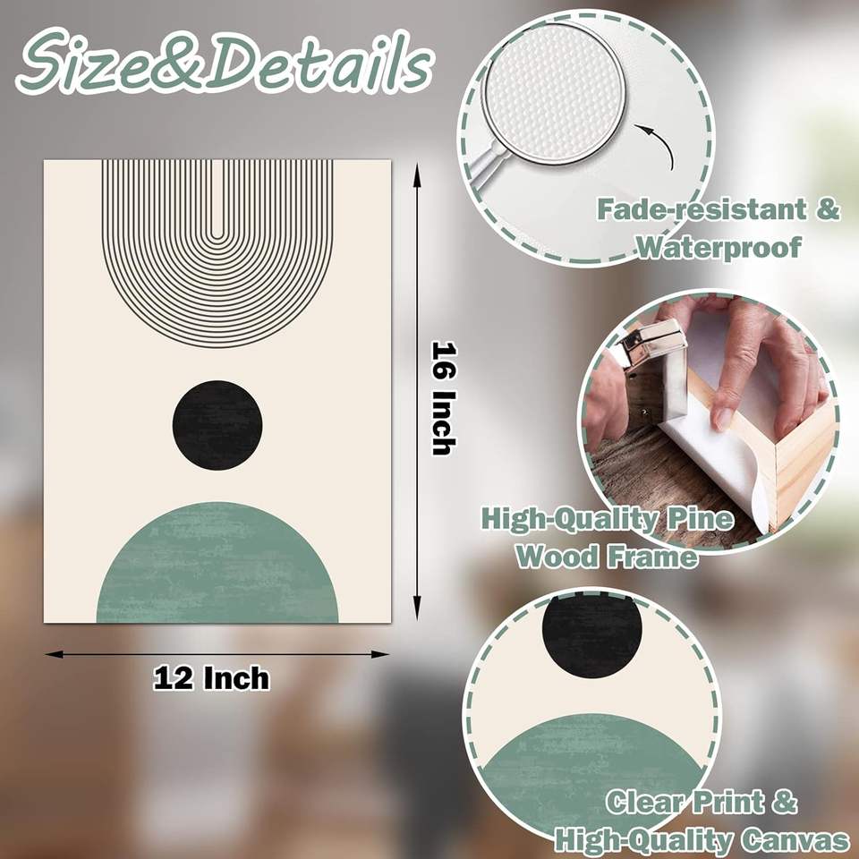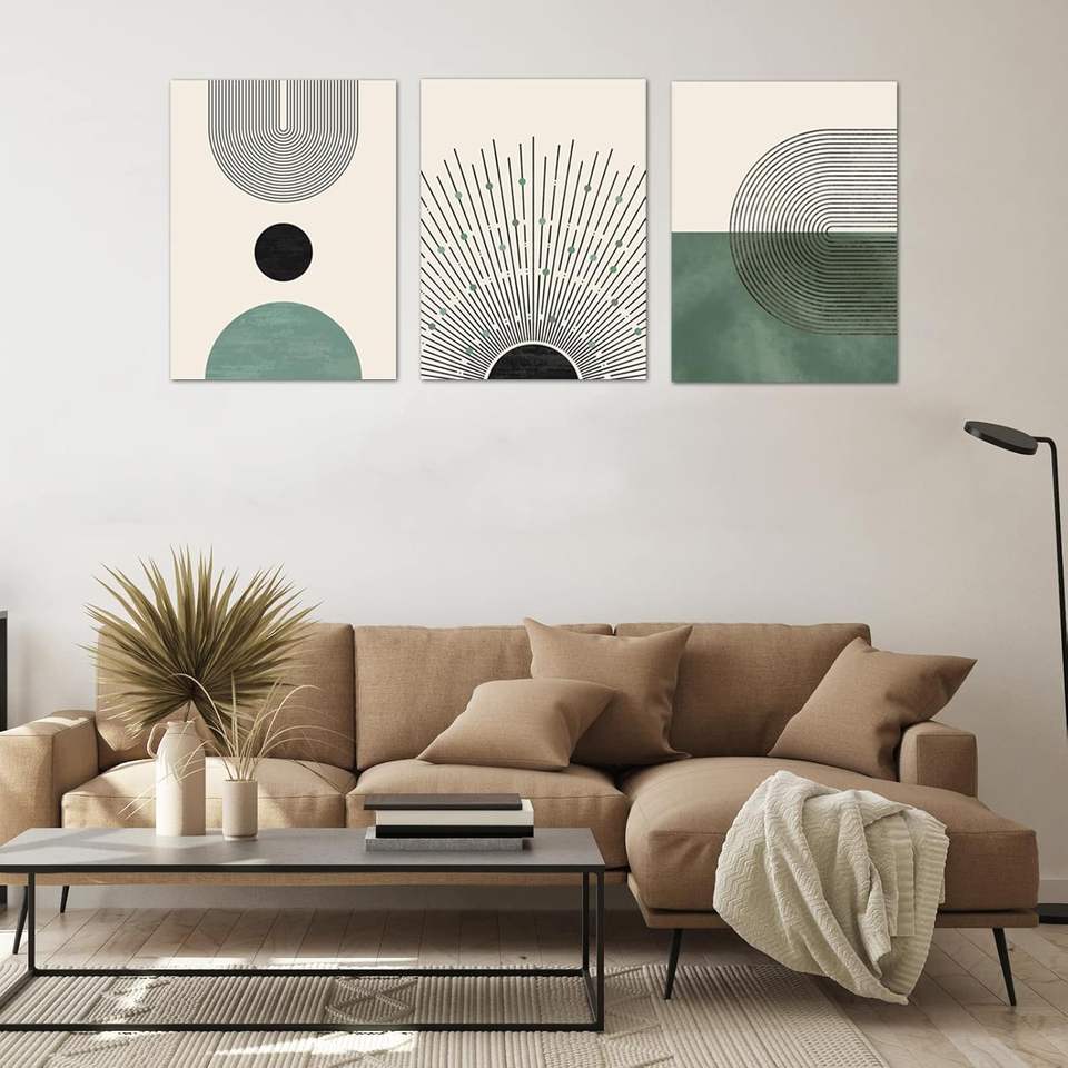 ชุดศิลปะติดผนังสไตล์โบโฮ3ชุดผ้าแนวเรขาคณิตแบบมินิมอลลิสสำหรับตกแต่งศิลปะผ้าใบสีเขียวดวงอาทิตย์สำหรับห้องพักที่ทันสมัย