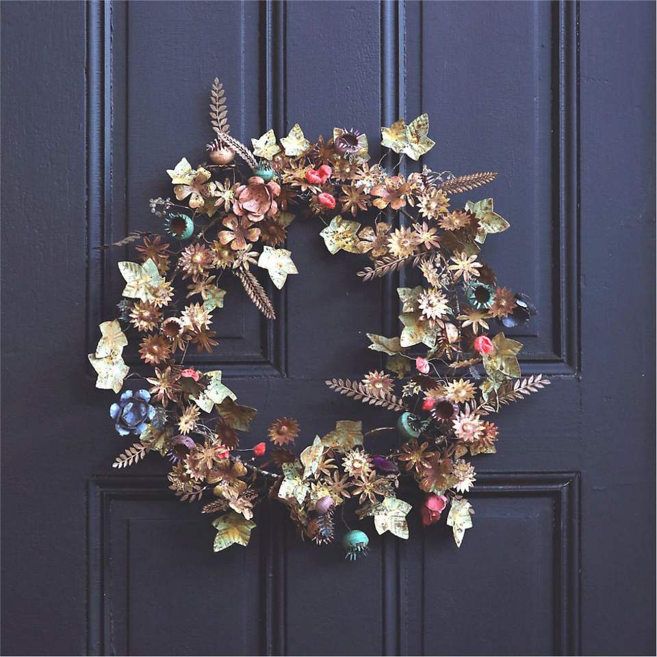 พวงหรีดใบไม้โลหะเคลือบทองเหลืองสไตล์โมเดิร์น ของตกแต่งผนังขนาดใหญ่ ประติมากรรมพฤกษศาสตร์โลหะ 3 มิติ สำหรับตกแต่งห้องนั่งเล่นและสถานที่ต้อนรับ