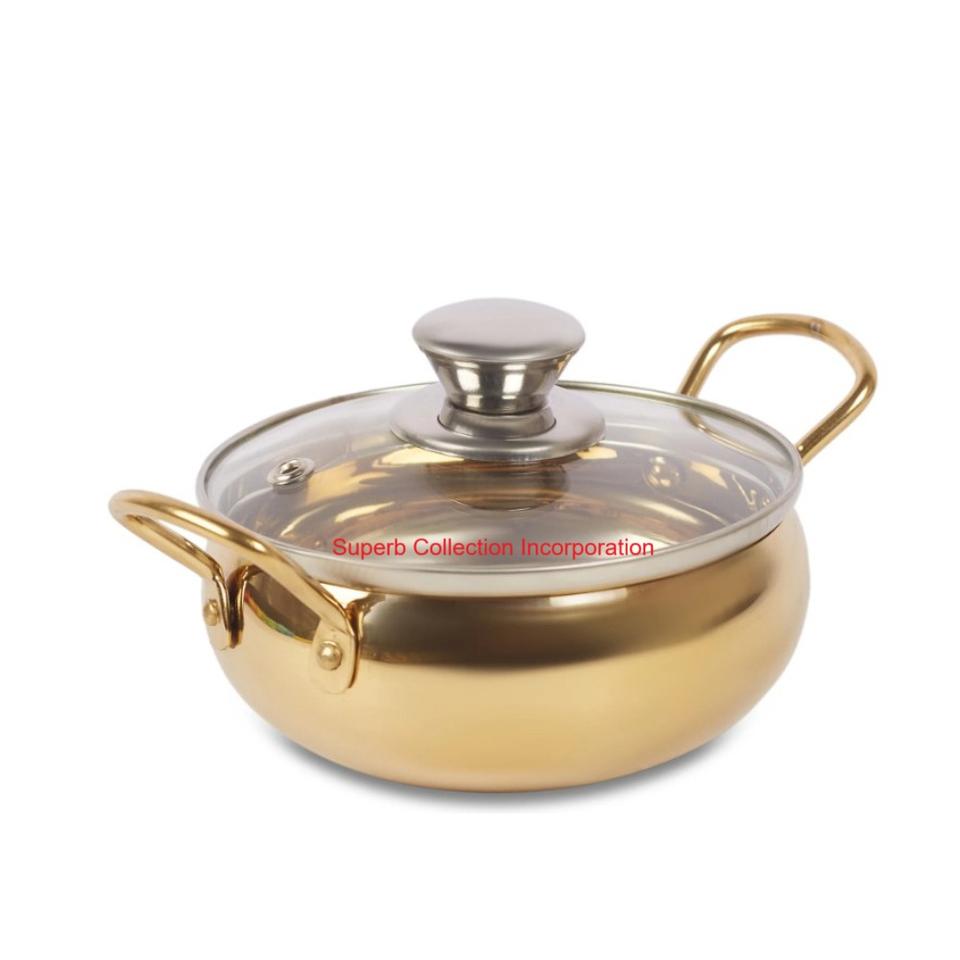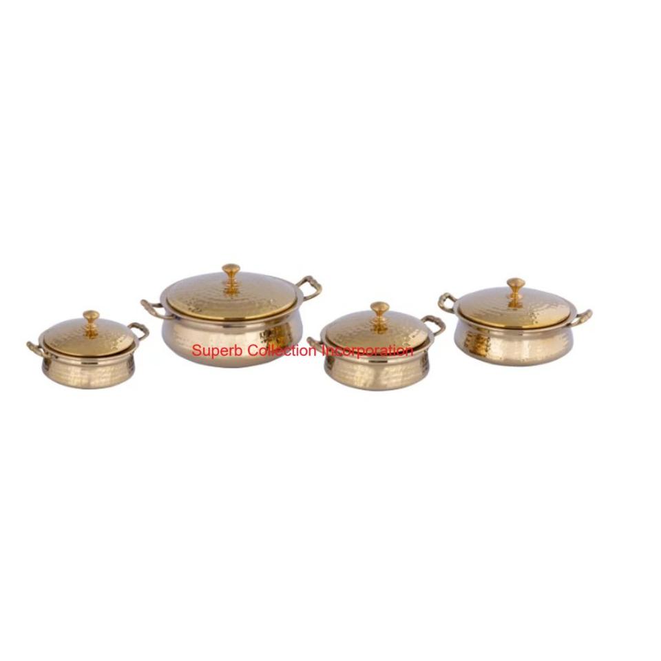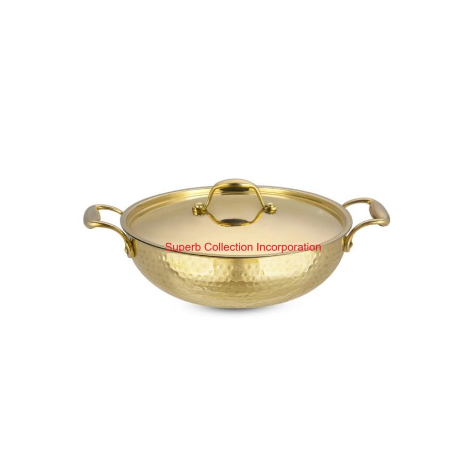 กาต้มน้ำทองเหลืองพร้อมฝาปิดหม้อปรุงอาหารอินเดียแบบดั้งเดิมสำหรับทอดลึกและเสิร์ฟสำหรับห้องครัวและการจัดเลี้ยงในบ้าน