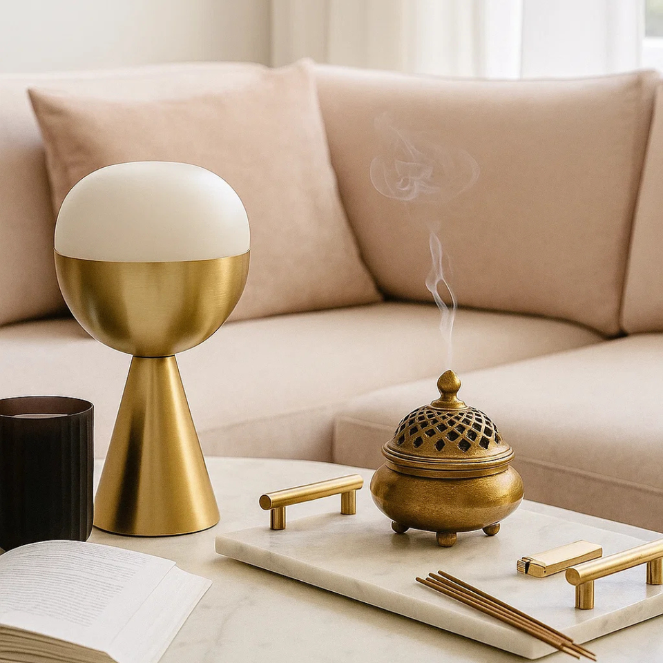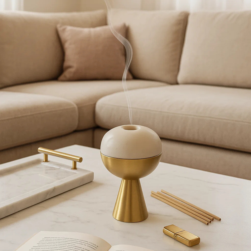 เครื่องพ่นอโรมาเทอราพีทำจากทองเหลืองหินอ่อนที่ทันสมัยเป็นมิตรกับสิ่งแวดล้อมสำหรับตกแต่งบ้านหรูหราที่วางธูปสมาธิในสปา