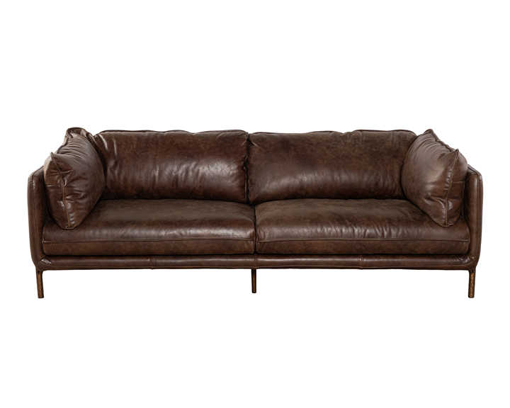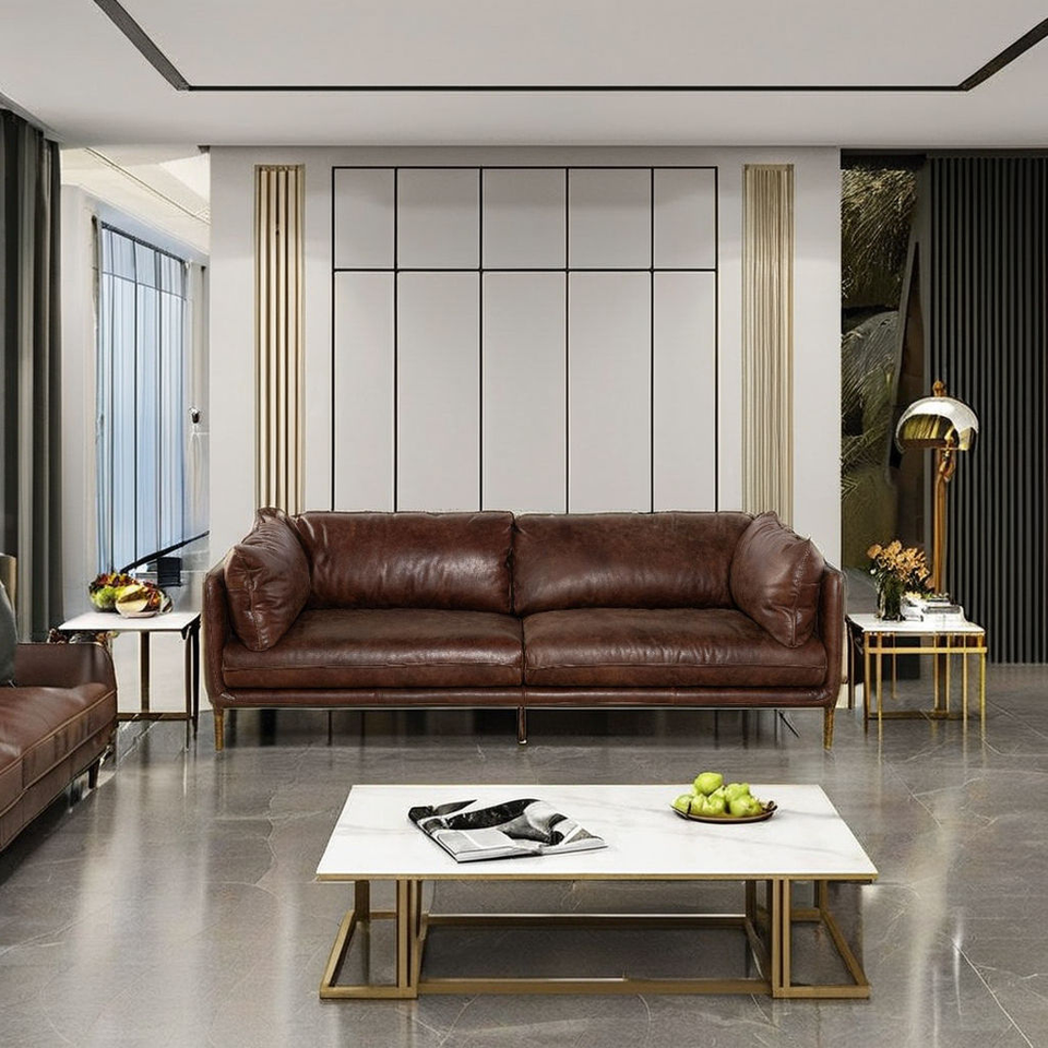 โซฟาหนังสีน้ำตาลทันสมัย ขาไม้เนื้อแข็ง โซฟาห้องนั่งเล่นสไตล์มินิมอล โซฟาหุ้มเบาะทนทานสำหรับบ้านและเฟอร์นิเจอร์โรงแรม